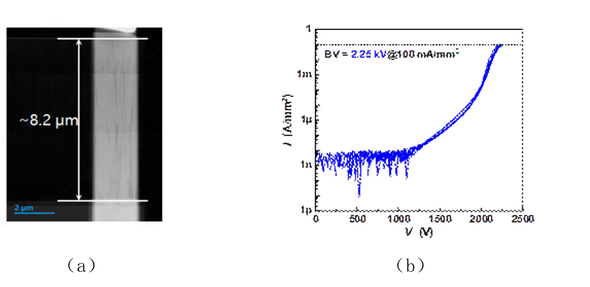 图2.(a)8英寸1200V Si基GaN厚膜外延TEM图;(b)1200V外延垂直击穿