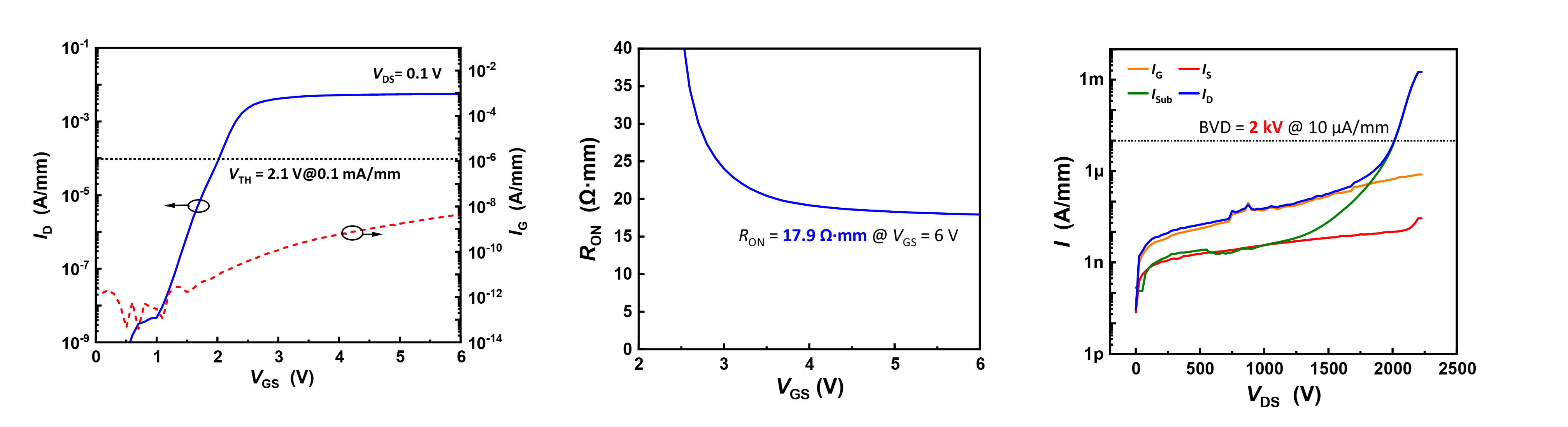 2)高性能高压器件制备技术:在8英寸厚膜外延上制备了1200V增强型Si基GaN HEMT科研小器件,器件展现出良好的增强型特性(阈值电压大于2V)和高耐压能力(漏极击穿电压大于2 kV)。